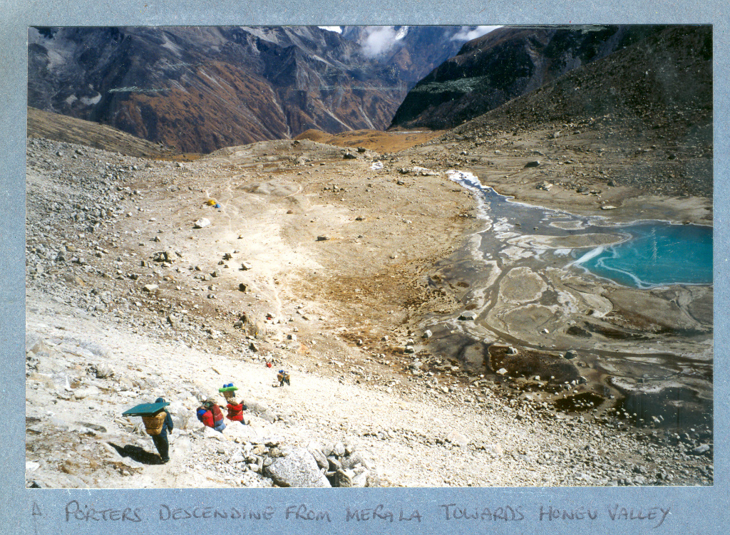 Porters descending from the Mera La towards the Hongu valley ← Previous Next → Porters descending from the Mera La towards the Hongu valley Porters descending from the Mera La towards the Hongu valley