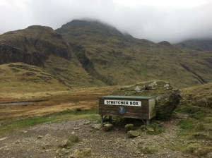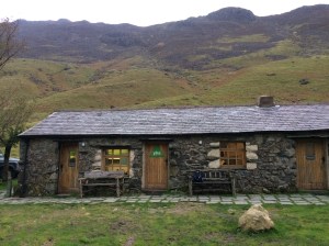 Dubs Bothy near Honister currently getting some repairs done, Haystacks is on the left.